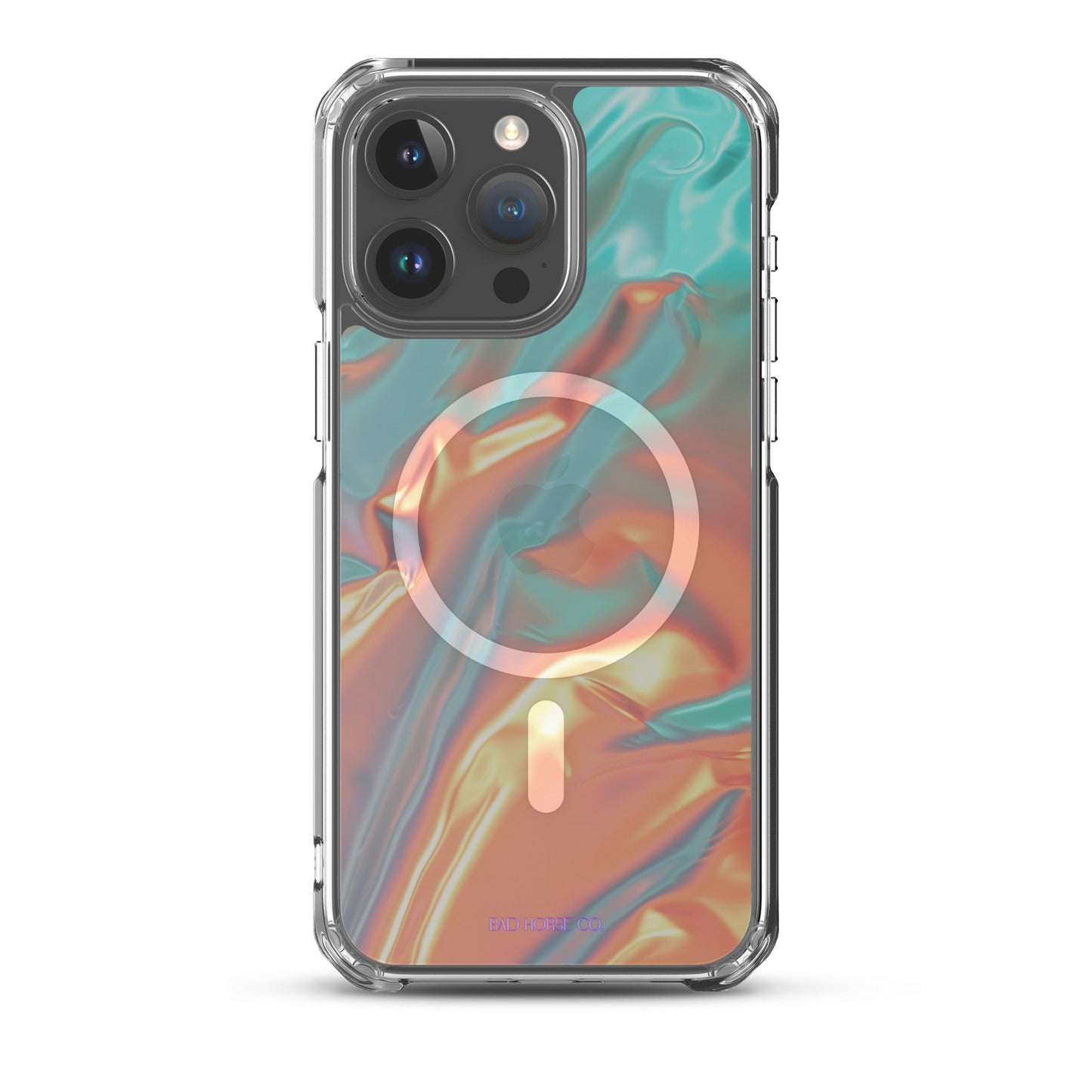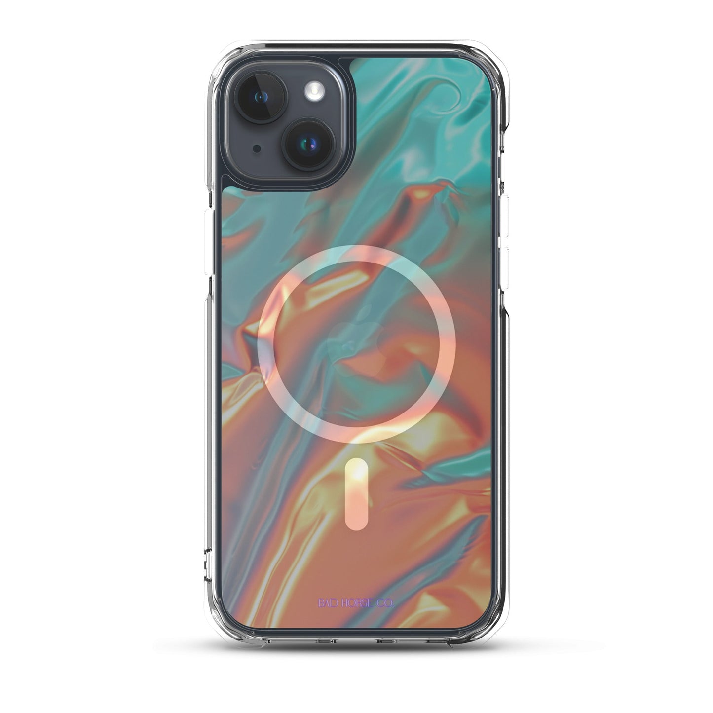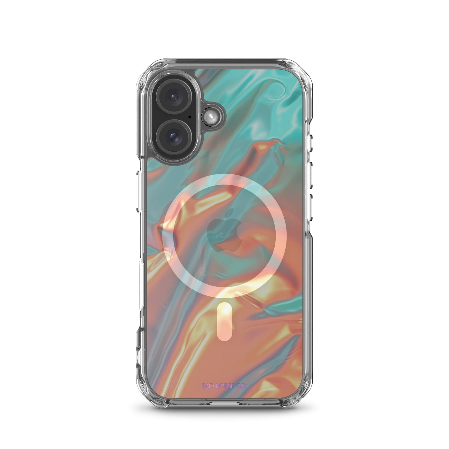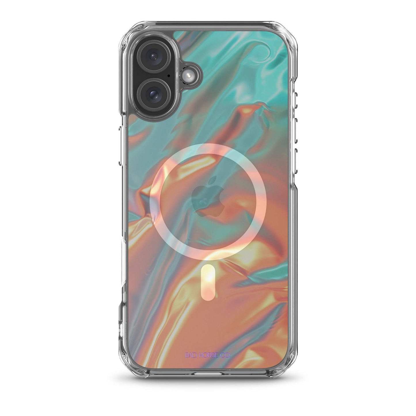 Bad Horse designed teal and orange holographic clear case is compatible with MagSafe and wireless charging. Easy to snap on and off and featuring a raised flexible bevel edge make this case a winner for convenience and unique style.