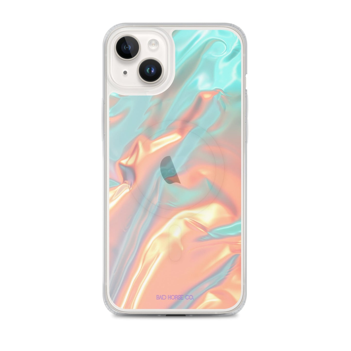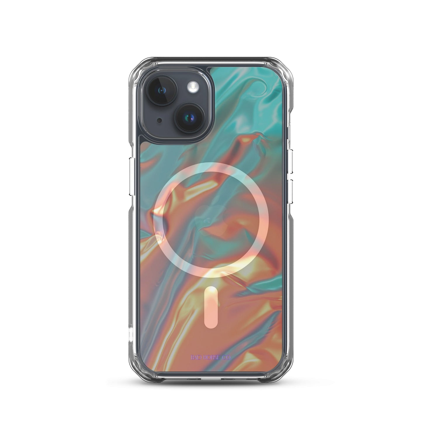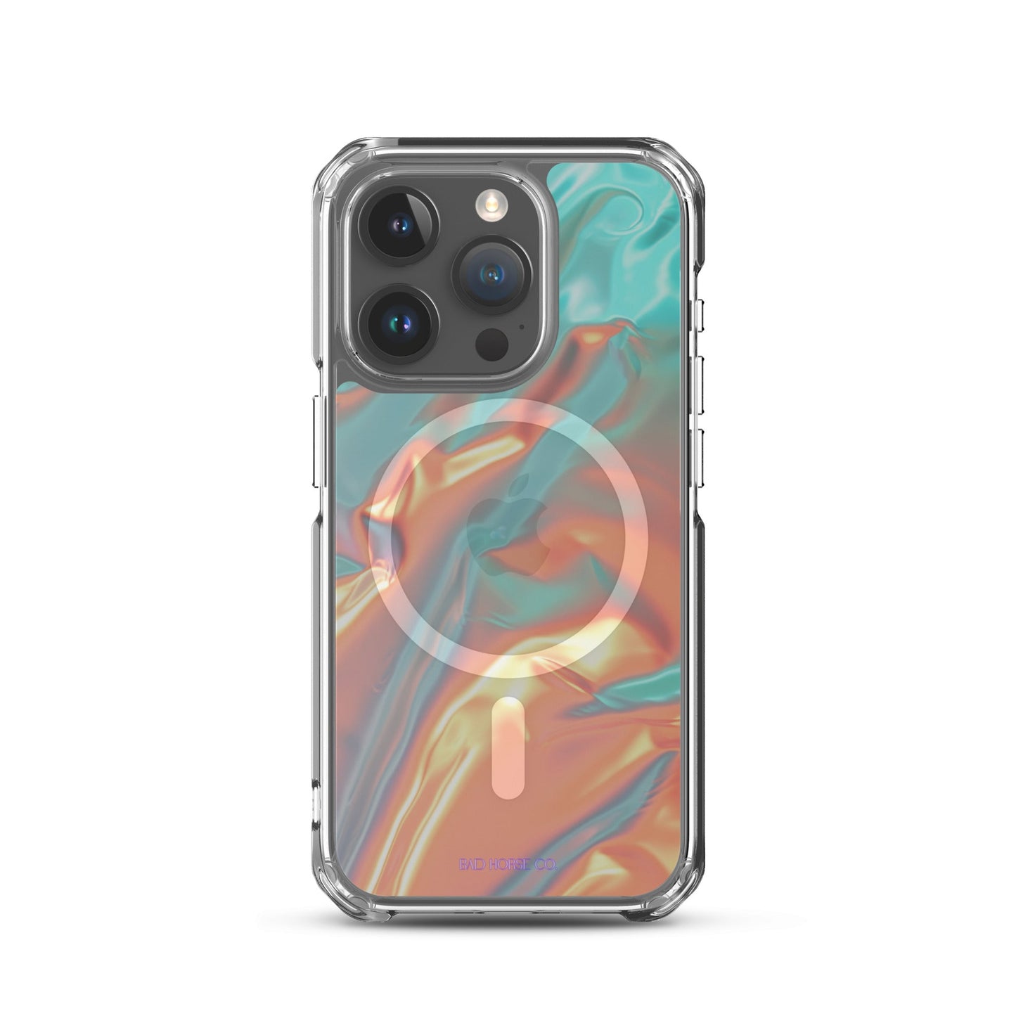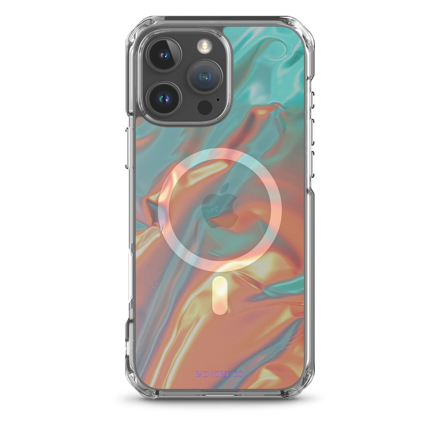 Bad Horse designed teal and orange holographic clear case is compatible with MagSafe and wireless charging. Easy to snap on and off and featuring a raised flexible bevel edge make this case a winner for convenience and unique style.