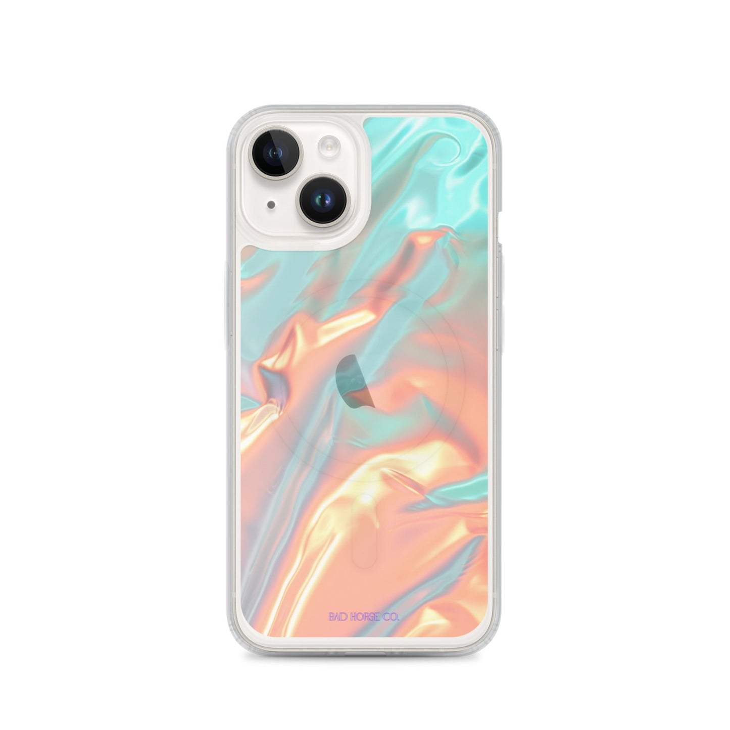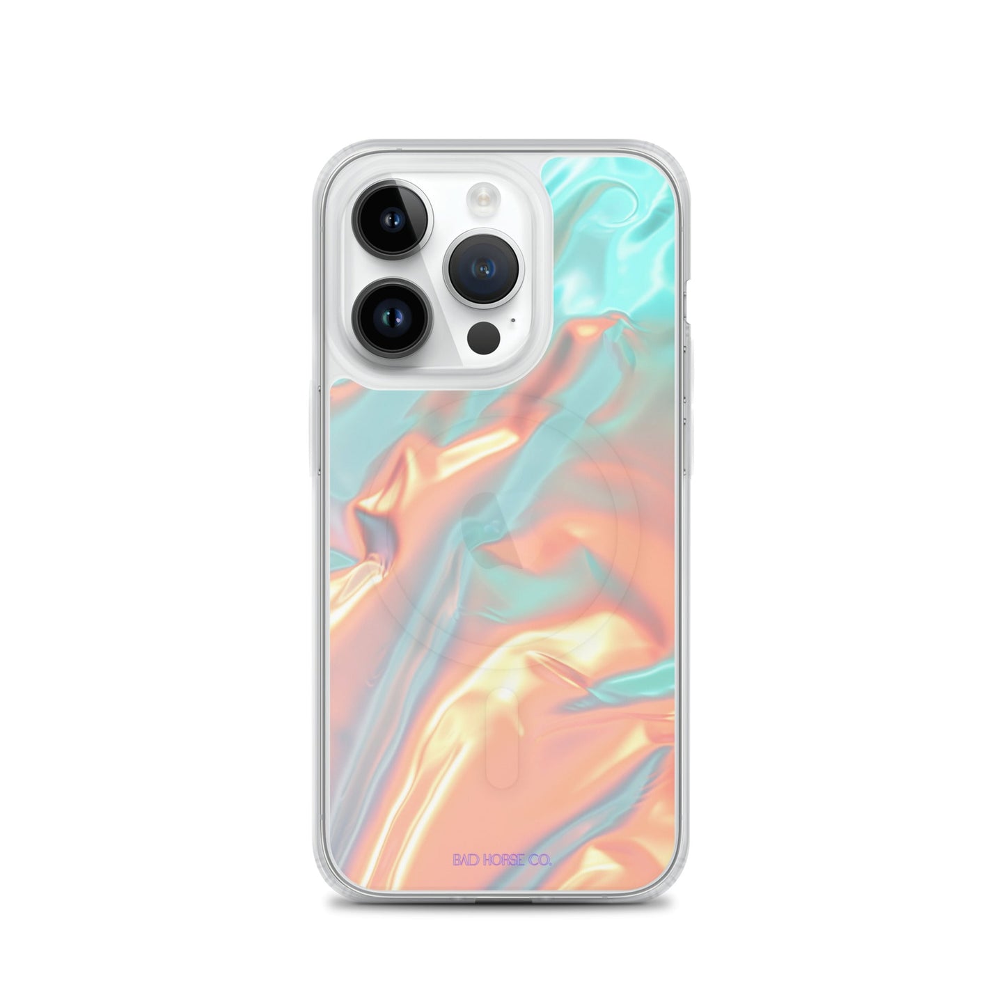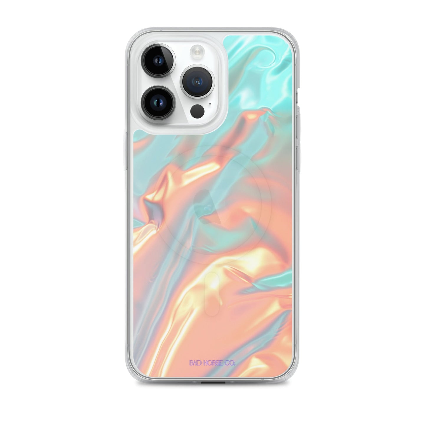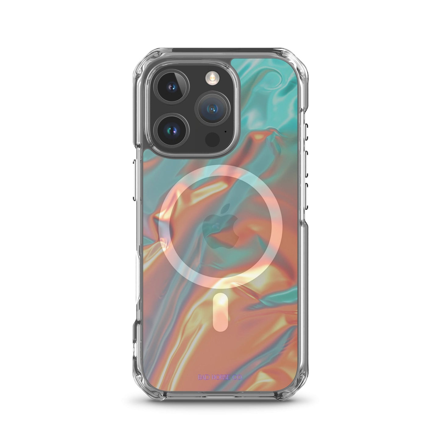Bad Horse designed teal and orange holographic clear case is compatible with MagSafe and wireless charging. Easy to snap on and off and featuring a raised flexible bevel edge make this case a winner for convenience and unique style.